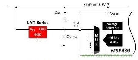 模擬溫度傳感器是一個有源半導體器件,它的輸出是與溫度成比例的電壓值或電流值。作為一個集成電路 (IC),模擬溫度傳感器具有熱敏電阻所不具備的內(nèi)置智能性,從而使與模擬溫度傳感器有關的設計工作變得簡單。圖3顯示了其中一款TI LMT系列模擬溫度傳感器的典型應用,在這個應用中,只有IC,而未使用外部組件。