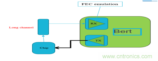 客戶的芯片的接收端可以支持FEC的糾錯功能,但要測試在不同的channel條件和不同的發(fā)送端均衡的設定下,芯片經過FEC后的誤碼率能降低到多少,如果將信號直接環(huán)回到芯片的輸入端的話,需要不停的修改芯片的FEC的參數(shù)來進行測試,但由于其芯片每修改一次FEC的參數(shù)如FEC的symbol size, block size,content size等等都需要重新對芯片進行代碼編譯和下載,每次下載需要幾分鐘的時間,由于不同的條件都要測試,則組合數(shù)量很多,導致測試效率非常低。