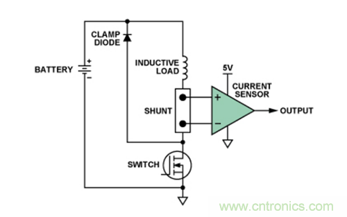 本例將詳細(xì)介紹一種典型的高端電流檢測應(yīng)用。圖1所示為汽車應(yīng)用環(huán)境中用于監(jiān)控電磁閥或其它感性負(fù)載的常見配置。