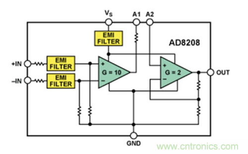 我們采用兩個具有類似設(shè)計(jì)的電流檢測放大器配置,研究了高頻干擾的影響。這兩個器件的功能和引腳排列完全相同;不過,其中一個內(nèi)置EMI濾波器電路,而另一個則沒有。