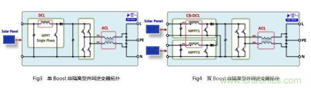 目前廣泛采用的非隔離并網(wǎng)住宅型光伏逆變器,其功率基本上為1.5 KW ~ 6 KW左右。為了實(shí)現(xiàn)高的性價(jià)比,并最大限度地提高轉(zhuǎn)換效率,業(yè)界甚至采用了SiC半導(dǎo)體、H5拓?fù)洹?電平拓?fù)涞雀鞣N新式技術(shù),但其最基本的拓?fù)洳煌夂鯃D3、4兩種: