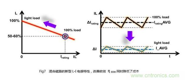 從中可知,要顯著提高其綜合效率,就必須最大限度地控制好較輕負(fù)荷時(shí)的功率損耗。利用混合磁路中不同磁材的特性,通過(guò)對(duì)其磁路長(zhǎng)度、磁阻及繞線匝數(shù)等影響電感特性的諸要素進(jìn)行優(yōu)化調(diào)節(jié),使之符合圖7所示的L-I直流電感偏置特性,從而可實(shí)現(xiàn)歐效改善與低成本設(shè)計(jì)的兼顧。