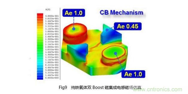 對(duì)于這種新型高效電感的設(shè)計(jì),和Boost電感設(shè)計(jì)要求一樣,要求該電感在大紋波電流工作時(shí),保持極佳的效率。由于其電感量可以設(shè)計(jì)成比較小的感值,即使要求直流內(nèi)阻較低,用銅量也能得到大幅的控制。對(duì)于磁性材料中的ΔB磁場(chǎng)變化率大的問題,同樣地采用Hybrid Magnetics技術(shù),可以控制磁性的損耗、減少漏磁的存在,達(dá)到很少的用銅量也能保持很低的內(nèi)阻的目的。