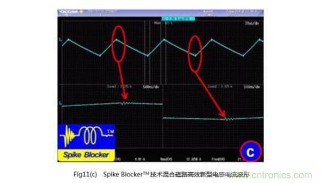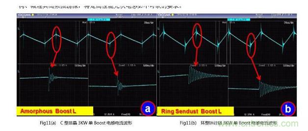 圖11(a)為目前廣為采用的C型非晶材料繞制的3 kW單Boost電感的額定功率時(shí)的典型工作電流波形。在Boost開通和關(guān)斷時(shí),電感電流出現(xiàn)了比較嚴(yán)重的高頻振蕩,其振蕩頻率成分也比較豐富,約在20~30 MHz寬帶上;Fig11(b)為采用數(shù)只φ47的鐵硅鋁磁環(huán)繞制的3 kW單Boost電感的波形,同樣圖中顯示出10 MHz左右的高頻衰減振蕩;Fig11(C)則為采用了優(yōu)化結(jié)構(gòu)和相關(guān)設(shè)計(jì)工藝規(guī)范的Spike Blocker TM技術(shù)后,使用Hybrid Magnetics混合磁路設(shè)計(jì)的新型高效能電感的實(shí)測(cè)波形(這些測(cè)試均基于相同設(shè)備、相同輸入輸出電壓、功率、工作頻率條件),由此可見,關(guān)注電感的EMC設(shè)計(jì)工藝規(guī)范具有十分重要的意義。