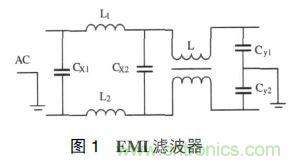 濾波是一種抑制傳導(dǎo)干擾的方法, 在電源輸入端接上濾波器可以抑制來自電網(wǎng)的噪聲對電源本身的侵害, 也可以抑制由開關(guān)電源產(chǎn)生并向電網(wǎng)反饋的干擾。電源濾波器作為抑制電源線傳導(dǎo)干擾的重要單元, 在設(shè)備或系統(tǒng)的電磁兼容設(shè)計中具有極其重要的作用。電源進線端通常采用如圖1 所示的EMI 濾波器電路。該電路可以有效地抑制交流電源輸入端的低頻差模騷擾和高頻段共模騷擾。在電路中, 跨接在電源兩端的差模電容Cx1、Cx2 ( 亦稱X 電容) 用于濾除差模干擾信號, 一般采用陶瓷電容器或聚脂薄膜電容器, 電容值通常取0.1~ 0. 47F。而中間連線接地的共模電容Cy1和Cy2 ( 亦稱Y 電容) 則用來短路共模噪聲電流, 取值范圍通常為C1=C2 # 2 200 pF。抑制電感L1、L2 通常取100~ 130H, 共模扼流圈L 是由兩股等同并且按同方向繞制在一個磁芯上的線圈組成, 通常要求其電感量L#15~ 25 mH。當(dāng)負(fù)載電流渡過共模扼流圈時, 串聯(lián)在火線上的線圈所產(chǎn)生的磁力線和串聯(lián)在零線上線圈所產(chǎn)生的磁力線方向相反, 它們在磁芯中相互抵消。因此, 即使在大負(fù)載電流的情況下, 磁芯也不會飽和。而對于共模干擾電流, 兩個線圈產(chǎn)生的磁場是同方向的, 會呈現(xiàn)較大電感, 從而起到衰減共模干擾信號的作用。