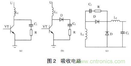 開關(guān)電源產(chǎn)生EMI 的主要原因是電壓和電流的急劇變化, 因而需要盡可能地降低電路中電壓和電流的變化率( du/ dt 和di/ dt ) 。采取吸收電路能夠抑制EMI, 其基本原理就是在開關(guān)關(guān)斷時為其提供旁路, 吸收積蓄在寄生分布參數(shù)中的能量, 從而抑制干擾的發(fā)生。可以在開關(guān)管兩端并聯(lián)如圖2( a) 所示的RC 吸收電路, 開關(guān)管或二極管在開通和關(guān)斷過程中, 管中產(chǎn)生的反向尖峰電流和尖峰電壓, 可以通過緩沖的方法予以克服。緩沖吸收電路可以減少尖峰電壓的幅度和減少電壓波形的變化率, 這對于半導(dǎo)體器件使用的安全性非常有好處。與此同時, 緩沖吸收電路還降低了射頻輻射的頻譜成份, 有益于降低射頻輻射的能量。箝位電路主要用來防止半導(dǎo)體器件和電容器被擊穿的危險。