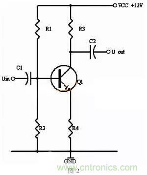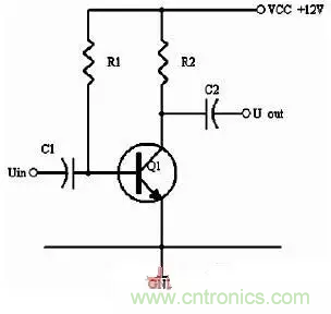 同理,當(dāng)輸入信號(hào)減小時(shí),則Ib減小,Ic電流減小,則電阻R2的電壓U2=Ic×R2會(huì)隨之減小,Uce=VCC-U2,會(huì)變大。在輸入信減小時(shí),Uce最大變化是從1/2的VCC變化到VCC。這樣,在輸入信號(hào)一定范圍內(nèi)發(fā)生正負(fù)變化時(shí),Uce以1/2VCC為準(zhǔn)的話就有一個(gè)對(duì)稱(chēng)的正負(fù)變化范圍,所以一般圖1靜態(tài)工作點(diǎn)的設(shè)置為Uce接近于電源電壓的一半。