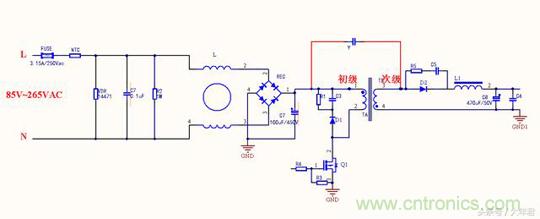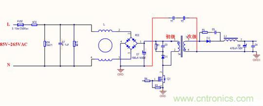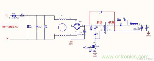 我們都知道Y電容是安規(guī)電容,是跨接L線地以及N線與地之間的電容,它的作用是抑制共模干擾。現(xiàn)在一共有三種等級,分別是是Y1, Y2, Y4。由于漏電流不能太大這是安規(guī)要求,漏電流太大人體觸摸用電器會有一種麻麻的感覺,因此一般Y電容容量大小為1nF到4.7nF之間。