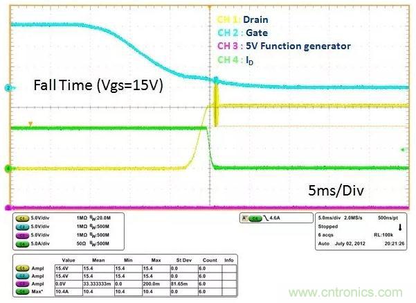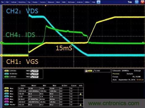 在電池保持板PCM過流關(guān)斷的過程中,從波形可以看到:功率MOSFET同樣也有較長(zhǎng)的一段時(shí)間工作于線性區(qū)。