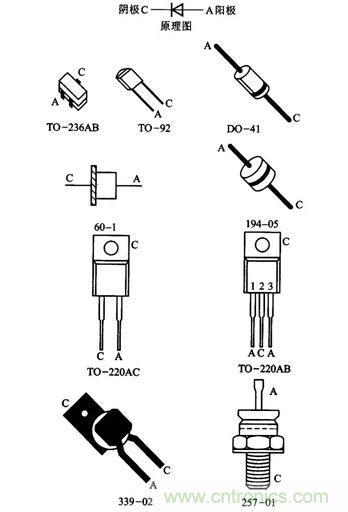 其它不同的封裝用不同的圖形表示。以辨認引腳,有少數(shù)幾種印上肖特基二極管符號。雖然看不見標記,但是圖8-24的194-05封裝用了這種方法。TO-220AC封裝有兩個陰極引腳,其中金屬片使兩個陽極連通。引腳和金屬片都可以用作肖特基二極管和電路連接端。而TO-220AB有兩個陽極引腳。由于它內(nèi)部有二個肖特基二極管,陽極有不同的端,但是內(nèi)部兩個陰極是連接在一起的。