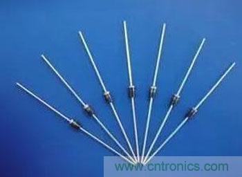 肖特基二極管有很多的封裝形式。圖8-24給出了一些例子,封裝的材料有塑料、玻璃、金屬、陶瓷、或這幾種的組合。使用的尺寸和外形不很多,一般來說,器件越大,額定電流越大。肖特基二極管的封裝常標明了陰極引腳。在陰極引腳邊通常都有一個或多個圓環(huán),圖8-24中的DO-41封裝就是采用這種方法。有一些老的封裝形式使用一個斜坡或是一個+號來標明陰極端。
