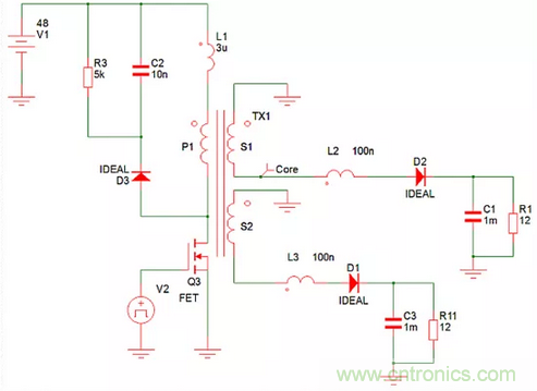 例如,一個反激式電源可分別從一個48V輸入產生兩個1 A的12V輸出,如圖1的簡化仿真模型所示。理想的二極管模型具有零正向壓降,電阻可忽略不計。變壓器繞組電阻可忽略不計,只有與變壓器引線串聯(lián)的寄生電感才能建模。這些電感是變壓器內的漏電感,以及印刷電路板(PCB)印制線和二極管內的寄生電感。當設置這些電感時,兩個輸出相互跟蹤,因為當二極管在開關周期的1-D部分導通時,變壓器的全耦合會促使兩個輸出相等。