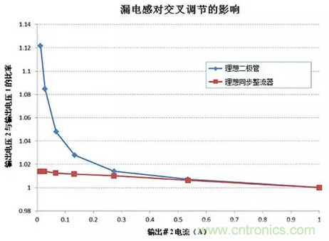 圖5:該圖顯示了兩個輸出之間的交叉調節(jié),其中1號輸出上的1-A負載保持穩(wěn)定,而2號輸出上的負載不斷變化,從而凸顯了同步整流器如何減輕漏電感的影響。