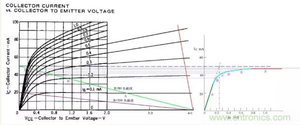 圖中假定電源電壓為4V,綠色的斜線是負載電阻為80歐姆的負載線,V/R=50MA,圖中標出了Ib分別等于0.1、0.2、0.3、0.4、0.6、1.0mA的工作點A、B、C、D、E、F。據(jù)此在右側(cè)作出了Ic與Ib的關(guān)系曲線。根據(jù)這個曲線,就比較清楚地看出“飽和”的含義了。曲線的綠色段是線性放大區(qū),Ic隨Ib的增大幾乎成線性地快速上升,可以看出β值約為200。蘭色段開始變彎曲,斜率逐漸變小。紅色段就幾乎變成水平了,這就是“飽和”。實際上,飽和是一個漸變的過程,蘭色段也可以認為是初始進入飽和的區(qū)段。在實際工作中,常用Ib*β=V/R作為判斷臨界飽和的條件。在圖中就是假想綠色段繼續(xù)向上延伸,與Ic=50MA的水平線相交,交點對應(yīng)的Ib值就是臨界飽和的Ib值。圖中可見該值約為0.25mA。