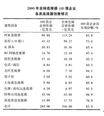 自2001年以來,受“9.11”恐怖事件、網(wǎng)絡(luò)通訊業(yè)泡沫破滅及美國經(jīng)濟(jì)低迷的影響,世界連接器市場一度遭受重創(chuàng),2001年的銷售額下降19.1%,但是,軍用連接器市場卻在平穩(wěn)中微增。據(jù)Fleck的研究報(bào)告,軍事/航天用連接器2000年的銷售額為20.072億美元,2001年達(dá)到20.118億美元,增長0.2%。全球連接器100強(qiáng)企業(yè)占據(jù)了69.1%軍用連接器市場份額,如表1所示。各類軍用連接器也基本上由全球100強(qiáng)企業(yè)所壟斷,如表2所示。