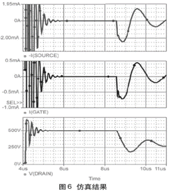 a.上方的曲線代表功率MOS的柵極電流。圖中的左邊部分對(duì)應(yīng)于關(guān)斷之后出現(xiàn)的寄生振蕩。漏極上出現(xiàn)的任何dV/dt都會(huì)在周圍所有電容中產(chǎn)生相應(yīng)的電流。