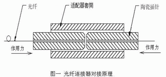 光纖連接器不能單獨使用,它必須與其它同類型的連接器互配,才能形成光通路的連接,目前,較為流行的光纖連接器裝配和對接方式為:利用環(huán)氧樹脂熱固化劑,將光纖粘固在高精度的陶瓷插針孔內(nèi),然后使兩插針在外力的作用下,通過適配器套筒的定位,實現(xiàn)光纖之間的對接(如圖一)。
