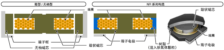 - NR 系列采用了混入鐵氧體粉末樹脂的成型技術(shù),只使用了鼓型磁芯形成了無袖構(gòu)造產(chǎn)品
