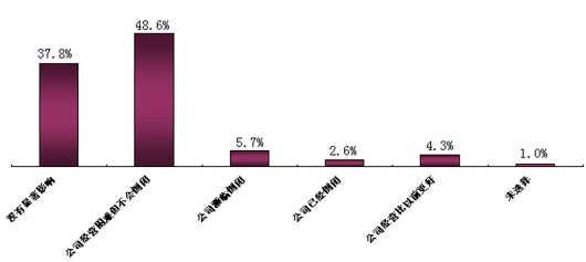 一個公司能否健康地發(fā)展,領導層的作用至關重要。常言道,滄海橫流方顯英雄本色,在經(jīng)濟牛市中,考驗的是企業(yè)決策人的遠見和膽識,在經(jīng)濟熊市中,就更需要企業(yè)領導層的聰明才智。此次調(diào)查顯示,超過64.3%的電子工程師給了自己的企業(yè)領導層很正面的評價,從這個結(jié)果來看,我們的電子行業(yè)的工作和諧程度還是較高的!