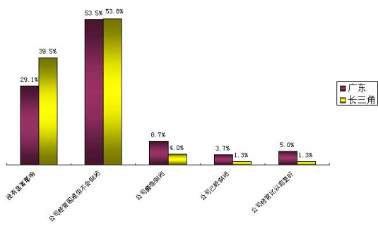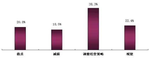 此項調(diào)查結(jié)果出乎我們的意料,選擇裁員的企業(yè)已經(jīng)占到了20.8%,但是多數(shù)企業(yè)還是選擇了調(diào)整經(jīng)營策略。我們特別希望有遠見的企業(yè)不要把裁員作為應對危機的主要措施,這也不符合我們“和諧社會”的主旋律。只要能正確的面對,認真分析企業(yè)的優(yōu)勢,研究市場的動向,合理配置企業(yè)資源,充分發(fā)揮員工的潛力,調(diào)動員工的積極性,企業(yè)一定會有新的轉(zhuǎn)機。企業(yè)如能和員工共克時艱,就會加深員工對企業(yè)的感情,這種情感會轉(zhuǎn)化為企業(yè)的一種優(yōu)勢資源。(見圖表四)