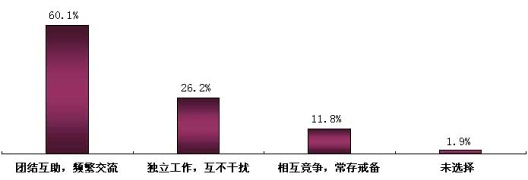 為了更深入了解電子工程師的生存環(huán)境,我們特意設置了這個問題。對每一位工程師來說,同事關系處理的如何,直接影響著他們的工作質(zhì)量和生活質(zhì)量,良好的同事關系,利人利己,利公利私。特別讓我們欣慰的是,60.1%的電子工程師和同事處于團結(jié)互助,頻繁交流的工作狀態(tài),在目前經(jīng)濟危機的陰霾籠罩下,這樣同事關系顯的尤為重要。(見圖表七)