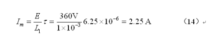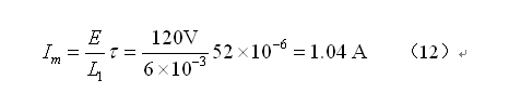 假設(shè)其它參數(shù)不變,而把工作電壓由360V降為110V時(shí),開關(guān)電源的最大占空比可取值為0.7708,即:D = 0.7708 。當(dāng)開關(guān)電源的工作頻率為40kHz時(shí),電源開關(guān)管導(dǎo)通時(shí)的脈沖寬度 = 19.27 ,由此可以求得流過開關(guān)電源變壓器初級(jí)線圈的最大電流Im為: