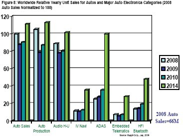繼黯淡的2008年和今年第一季度之后,最近某些地區(qū)的汽車銷售情況要好于預(yù)期,主要是因?yàn)檎雠_(tái)的激勵(lì)措施。雖然2009年仍將低迷,但今年下半年汽車銷售情況將比上半年明顯改善。這將導(dǎo)致2010年汽車電子的年銷售額出現(xiàn)增長(zhǎng)。汽車電子領(lǐng)域包括汽車音響本體、導(dǎo)航、高級(jí)駕駛輔助系統(tǒng)(ADAS)、嵌入遠(yuǎn)程信息處理與藍(lán)牙。