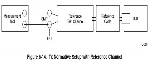 在USB3.0的TX的眼圖和抖動(dòng)測(cè)試中,測(cè)量的是待測(cè)試信號(hào)經(jīng)過參考測(cè)試信道后TP1點(diǎn)的眼圖和抖動(dòng)。如下圖4中的Reference test channel即為參考測(cè)試信道,在規(guī)范中定義了long channel、short channel和3米電纜三種參考測(cè)試信道。如果使用long channel或者較長(zhǎng)電纜,信號(hào)到達(dá)接收端時(shí)衰減比較大,眼圖已經(jīng)閉合,USB3.0芯片接收端使用了CTLE均衡器對(duì)信號(hào)進(jìn)行均衡后(CTLE均衡器介紹見本文最后一部分),信號(hào)眼圖的質(zhì)量將大大改善,所以要求測(cè)試儀器分析出CTLE均衡器處理后信號(hào)的眼圖和抖動(dòng)。