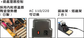 采用精密CPU數位控溫電路, 和日本進口陶瓷發(fā)熱體, 精準控制溫度200~480ºC, 整體防靜電結構, 輸入電壓AC 110V/220V可切換, 配合安全回路保護, 流線可堆疊外型, 開關前置、斜面無視角差, 適合各種環(huán)境使用焊臺、烙鐵架分離設計, 并具有錫絲架功能、使用便利.