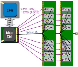DDR2在DDR的基礎上將芯片接口時鐘頻率提高一倍并將工作電壓從2.5V降低至1.8V,從而使其能在相對更低的功耗下獲得更高的傳輸速率。一般情況下,DDR2的輸入時鐘頻率覆蓋200/266/333/400/533MHz,傳輸比特率覆蓋400/533/667/800/1066Mb/s/pin。相對于DDR,由于速度的提升,DDR2在主板設計要求上也有所變化。內(nèi)存控制器每Channel可級聯(lián)的DIMM數(shù)從DDR時期的4到8條減少至2到3條,數(shù)據(jù)線(DQ)上的終端電阻從主板上的分立電阻搬移到了DRAM芯片內(nèi)部(ODT),數(shù)據(jù)同步信號(DQS)由單端信號變?yōu)閱味嘶虿罘挚蛇x信號。DDR2主板系統(tǒng)架構(gòu)如右圖所示。