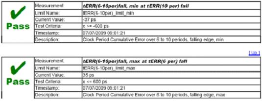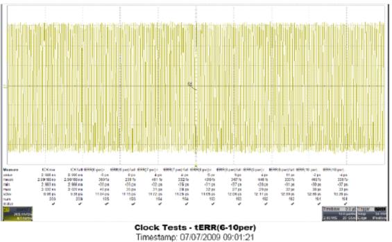 JEDEC標準要求測量n分別為2、3、4、5、6-10、11-15時tERR(n per)的最大及最小值。對于這樣的要求,如果要用手工測量將是非常耗時且低效率的。力科QPHY-DDR2軟件包的時鐘測量部分支持上述所有參數(shù)的自動測量,僅需使用一根差分探頭將時鐘信號接入示波器即可完成所有的測量工作,測量后的所有參數(shù)結(jié)果及對應波形將列在自動生成的測試報告中并與JEDEC標準中門限值進行比較。如下圖為使用QPHY-DDR2測量tERR(6-10 per)時的部分結(jié)果與對應波形。