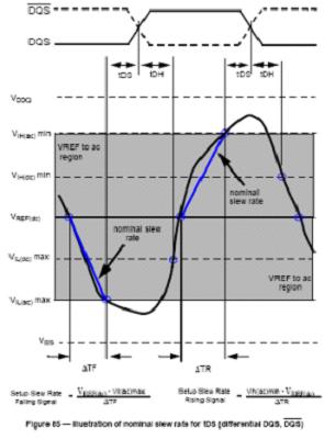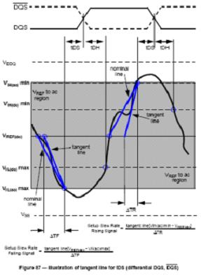 為了在上表中查到對應的修正值,需要首先得出相應信號的斜率。JEDEC標準規(guī)定了兩種斜率計算方法,即直連斜率norminal slew rate和切線斜率tangent slew rate,分別在不同數(shù)據(jù)波形時采納。兩種斜率計算方法如下圖所示。