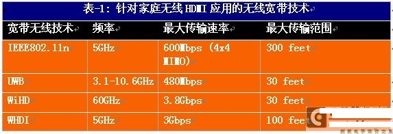 目前,有如表-1中所列幾種針對高清顯示器和投影儀的寬帶無線技術(shù)。