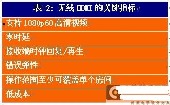 無線HDMI的目標(biāo)是提供與有線HDMI相同的用戶體驗。由此我們在表-2中列出無線HDMI的幾項關(guān)鍵指標(biāo):