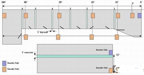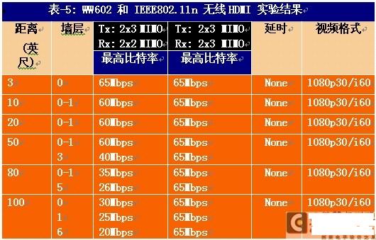 相對于可視距離的無線通信的應(yīng)用,802.11n可實現(xiàn)更遠(yuǎn)距離的(非可視距離)的多媒體通信,比如在家里的不同房間之間的音視頻通過無線播放。我們用標(biāo)準(zhǔn)的802.11的產(chǎn)品用來測試,證明魯棒性很好,可以穿越墻壁和混凝土樓板,圖-1是測試環(huán)境圖示,用SONY的PS3游戲機(jī)作為高清的視頻源,源和顯示設(shè)備之間距離100英尺并穿越6面墻,視頻的內(nèi)容包括游戲和電影視頻。表5是測試結(jié)果,一組是編碼端和解碼端都是2x3MIMO(2個發(fā)送天線和3個接收天線)的無線設(shè)備,另一組采用編碼端2x3MIMO,接收端2x2MIMO的無線設(shè)備。WW602編碼用20Mbps碼流的圖像質(zhì)量可超越高清電纜傳輸?shù)?-15Mbps的圖像質(zhì)量。