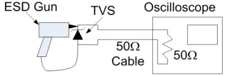 比較保護(hù)二極管鉗位電壓的最佳途徑是采用示波器來對發(fā)生ESD事件期間通過二極管的實際電壓波形進(jìn)行屏幕截圖。這可以通過圖1所示的測試設(shè)置來實現(xiàn)。[page]