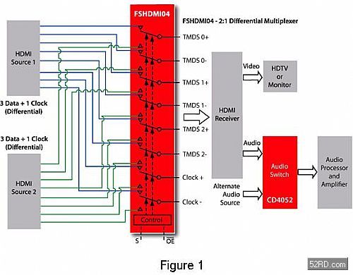 以FSHDMI04 這類HDMI開關(guān)為例,只需簡(jiǎn)單地插入到選定的HDMI接收器和兩個(gè)HDMI連接器之間即可。若針對(duì)一個(gè)完整的解決方案,還需要切換較高電壓及較低頻率的控制信號(hào),建議使用一個(gè)至少165MHz的簡(jiǎn)單5V 方型 SPDT開關(guān),例如FSAL200 或 FSAV330。這些控制信號(hào)用于接收器(Sink) 和資料源(Source) 之間的首次交換,而資料源以此來決定接收器能夠處理什麼樣的視頻解析度,只需要FSHMDI04加上第二個(gè)用于控制資料的開關(guān),即可在單輸入設(shè)計(jì)上完全實(shí)現(xiàn)第二個(gè)HDMI輸入埠。