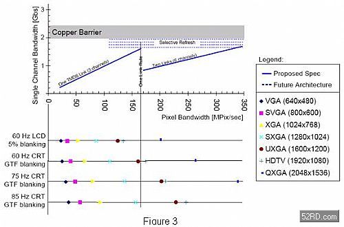 DVI是市場(chǎng)上第一個(gè)標(biāo)準(zhǔn)化的純數(shù)字視頻連接。與HDMI一樣,它對(duì)單或雙鏈路配置的需求取決于所選的顯示器解析度,以及顯示器類型和相應(yīng)的更新頻率。DVI端子在電腦應(yīng)用中仍然相當(dāng)普及,許多系統(tǒng)都具有DVI輸出以便實(shí)現(xiàn)至數(shù)字LCD 顯示器的直接數(shù)位連接。舉例說,一個(gè)更新頻率為60Hz的高解析度 LCD顯示器(1920x1080)可利用單鏈路DVI和約130MHz的時(shí)脈頻率連接。這可參考圖3 的DVI規(guī)格參考。