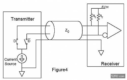 許多設(shè)計(jì)人員都很熟悉電壓驅(qū)動(dòng)應(yīng)用,并因此很自然地設(shè)想導(dǎo)通阻抗是開關(guān)選擇中最重要的規(guī)格。這種設(shè)想出于在電壓源應(yīng)用中,導(dǎo)通阻抗往往會(huì)引起插損和信號(hào)衰減。但幸運(yùn)地,HDMI 和 DVI信號(hào)并沒有這個(gè)問題,因?yàn)樗鼈兪褂镁哂薪K端電阻的電流源來建立信號(hào)電平。圖4所示為如何建立TMDS信號(hào)的基本原理圖。