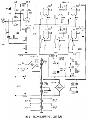 圖3是6KD6五極管OTL功放電路圖。它是將普通束射四極管或五極功率電子管改為三極管接法的OTL功放,利用了電子管簾柵極在相同柵壓下可以輸出較大電流的特點。原來由于相對的屏極內(nèi)阻較大,限制了工作電流,但改成三極管接法以后,簾柵極的電壓與屏極電壓處于同等電位,屏極內(nèi)阻大幅度下降,加強了屏極承受較大電流的能力,因此能在低阻抗負(fù)載下輸出較大功率。