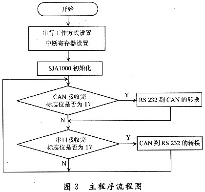 在微處理控制下,RS232和CAN進(jìn)行數(shù)據(jù)交換時(shí),采用串口接收和CAN中斷方式可提高工作效率。SJAl000的初始化在復(fù)位模式下才可以進(jìn)行,主要包括工作方式的設(shè)置、時(shí)鐘分頻和驗(yàn)收濾波寄存器的設(shè)置、波特率參數(shù)的設(shè)置以及中斷允許寄存器的設(shè)置等。其主程序流程圖如圖3所示。