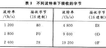 檢測(cè)轉(zhuǎn)換裝置的串口波特率,首先可對(duì)主機(jī)的接收波特率(以9600b/s為例)進(jìn)行設(shè)定,并在終端發(fā)送一個(gè)特定的字符(以回車符為例),這樣,主機(jī)根據(jù)接收到的字符信息就可以確定轉(zhuǎn)換裝置的通信波特率。回車符的ASCII值是0DH,在不同波特率下接收到的值如表1所列。[page]