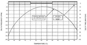 溫度的不穩(wěn)定和相應(yīng)的溫度系數(shù)是許多應(yīng)用所面臨的問題,特別是那些工作在寬溫范圍的應(yīng)用,如室外電表或水表。標(biāo)準(zhǔn)的用作RTC時(shí)基的32.768kHz音叉晶體的頻率響應(yīng)與溫度之間的關(guān)系為Δf/f=k(T-T0)2+f0。其中,Δf為頻率偏差,f為基頻,k為曲率,T為溫度,T0為折點(diǎn)溫度,f0為折點(diǎn)溫度處的頻偏。