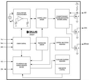 本節(jié)將以Maxim公司的DS32kHz溫補(bǔ)晶體振蕩器為例,介紹通過改變晶體負(fù)載電容修正由于溫度變化產(chǎn)生的頻偏的概念,如圖2所示,Maxim的這項(xiàng)內(nèi)部校準(zhǔn)技術(shù)還獲得了專利。DS32kHz可以作為大多數(shù)系統(tǒng)的32kHz輸入,如RTC或內(nèi)置RTC的微控制器。