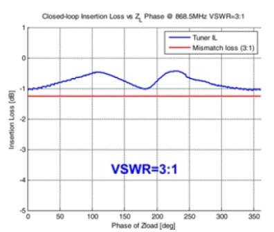 圖4:對(duì)自適應(yīng)閉環(huán)系統(tǒng)的仿真顯示,與未使用天線(xiàn)調(diào)諧器的系統(tǒng)(紅線(xiàn))相比,加入天線(xiàn)調(diào)諧器(藍(lán)線(xiàn))可降低插入損耗。