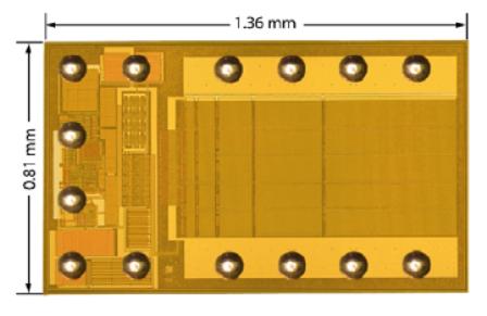 Peregrine半導(dǎo)體公司的設(shè)計(jì)人員已基于該公司的UltraCMOS工藝和HaRP創(chuàng)新設(shè)計(jì)開(kāi)發(fā)出DuNE技術(shù),并已申報(bào)專(zhuān)利。DuNE數(shù)字可調(diào)電容器(DTC)芯片是為滿(mǎn)足天線(xiàn)調(diào)諧要求而設(shè)計(jì)的,它內(nèi)含一些高Q值電容和一個(gè)串行接口,并具有偏置電壓低和線(xiàn)性度高的優(yōu)點(diǎn)。該器件采用倒裝芯片封裝,面向GSM/WCDMA手機(jī)的DuNEDTC的尺寸為1.36×0.81mm(見(jiàn)圖5)。
