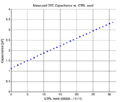 圖6:實(shí)測(cè)結(jié)果表明,5位DuNEDTC器件具有良好的線(xiàn)性調(diào)諧特性,電容范圍為1.15到3.4pF(調(diào)諧比為3:1)。