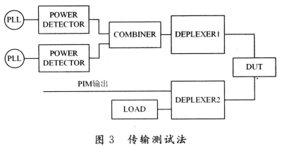 該系統(tǒng)中兩個(gè)大功率載頻f1和f2通過(guò)雙工濾波器發(fā)射到DUT,終端接50 Ω負(fù)載。PIM產(chǎn)生的雜散信號(hào)在DUT中產(chǎn)生,并在兩個(gè)方向傳播——“前向”到匹配負(fù)載,“反向”到雙工濾波器。發(fā)射激勵(lì)信號(hào)的頻率和被測(cè)的IM產(chǎn)物的頻率由雙工濾波器的TX和RX通道決定。接收機(jī)測(cè)量反向傳播的IM波功率。