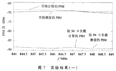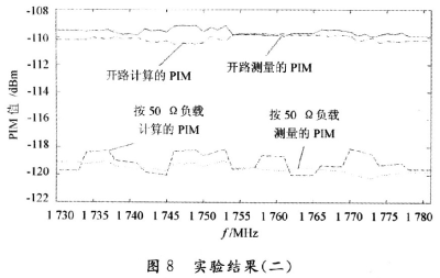 由以上的分析可知,這種計(jì)算方法計(jì)算出來(lái)的PIM值和真實(shí)的PIM值十分接近,并且隨頻率的變化趨勢(shì)一致。同時(shí)可以看出,在開(kāi)路的時(shí)候所測(cè)量的 PIM明顯要比接負(fù)載的時(shí)候所測(cè)量的PIM要大,增大的PIM值是因?yàn)槠ヅ洳缓盟斐?,?dāng)然,相同的負(fù)載狀況在不同的頻率下呈現(xiàn)的匹配狀態(tài)是不一樣的。