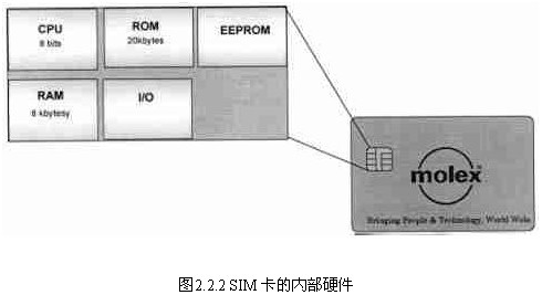 SIM卡的內部硬件與普通的IC卡類似,是由CPU、ROM、RAM和EEPROM等部件組成的完整單片計算機(圖2.2.2),生產廠商已經在每一張卡 內存入了廠商代號、生產串號、卡的資源配置數(shù)據等基本參數(shù),并為卡的正常工作提供了適當?shù)能浻布h(huán)境。它與手機內其它部份的物理界面有:數(shù)據線 (DATA)或串行輸入/輸出(I/O)、復位線(RST)、時鐘(CLK)、編程電壓(VPP)、電源(VCC)和地(GND)。這些都需要通過連接器同機內其它部份相互連接。